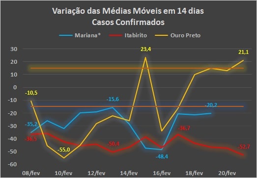 A análise da comparação de cada média móvel com a observada 14 dias antes (gráfico abaixo), mostra uma anomalia nos números de Ouro Preto no dia 15 de fevereiro, provavelmente devido ao represamento de resultados, mas confirma a tendência de agravamento da situação, com variação de 21,1% no dia 21, em relação ao dia 7, colocando o município na zona acima da caracterizada como de estabilidade.