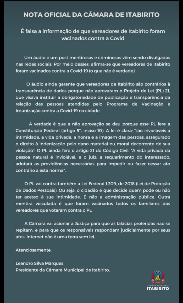 O texto, assinado pelo Presidente da Câmara, Leo do Social, um dos vereadores que votou contra o projeto de transparência da vacina, alega ser falsa a denúncia compartilhada através de áudios por WhatsApp, e cita o projeto de autoria do vereador Max Fortes.