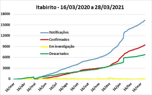 Os dados divulgados no boletim deste domingo (28) indicavam que o município contabilizava 16.309 notificações, 9.454 casos confirmados e 6.788 descartados, com destaque para as 898 novas notificações, 595 casos positivos e 289 casos descartados, de 15 aa 28 de março. As relações descartados/positivos e descartados/notificados caíram para 71,8 e 41.6%, respectivamente.