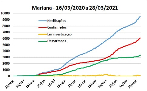 Com 9.537 notificações, 6.083 resultados positivos e 3.309 casos descartados, Mariana teve aumento de 106,3% nos casos confirmados, número praticamente igual aos 106,4% de aumento nos casos notificados, na comparação das duas quinzenas do mês. Já para os casos descartados o aumento foi de 228,2%, praticamente dobrando o número de recuperados (aumento de 95,3%). Assim, a relação entre descartados e positivos passou para 54,4%, enquanto a proporção entre descartados e notificados caiu para 34,7%.