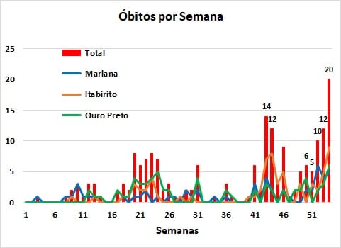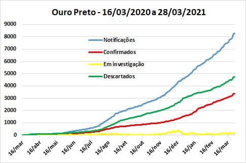 Com 47 óbitos anunciados até domingo (28), os municípios de Mariana, Itabirito e Ouro Preto têm, em março o pior resultado da pandemia, suplantando os números de vítimas ocorridos em agosto (31) e janeiro (38). Na noite desta terça-feira (30) a Região dos Inconfidentes soma 198 mortes devidas à Covid-19.