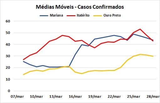 Boletins de Itabirito e Ouro Preto, em 28/03, e de Mariana em 29/03