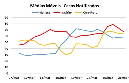 Em termos de médias móveis de casos notificados e confirmados, as variações diárias nas últimas semanas, nas cidades da Região dos Inconfidentes, são apresentadas nos gráficos abaixo. A cada dia, o valor da média móvel é calculado a partir da média do número de novos casos (notificados e confirmados) em sete dias, incluindo o dia de referência.