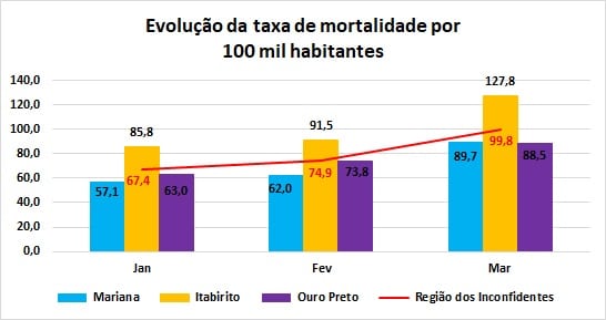 Esses números, considerando apenas 28 dias de março, elevam para 0,99% a taxa global de letalidade da Região dos Inconfidentes, com praticamente 100 óbitos para cada grupo de 100 mil habitantes.