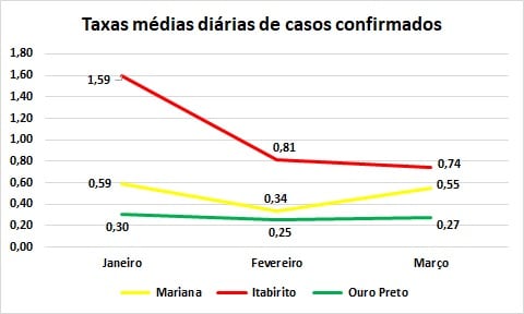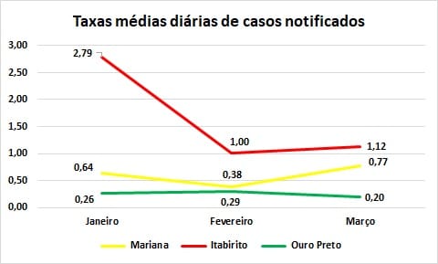 Observa-se que, em ambas as situações (casos notificados e confirmados), Itabirito apresenta as médias mensais mais altas, seguido de Mariana e Ouro Preto. Porém, enquanto Itabirito registra pequeno aumento para os casos notificados e queda nos casos com resultados positivos, a situação de Mariana mostra-se com tendência de elevação nos dois cenários, enquanto em Ouro Preto a situação é de estabilidade.