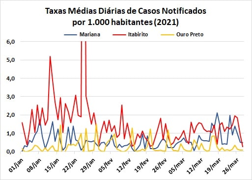 É importante ressaltar que, em janeiro, quando os municípios de Mariana, Itabirito e Ouro Preto somaram 38 óbitos, 60,5% ocorreram em Itabirito, 21% em Mariana e 18,5% em Ouro Preto. Nos 28 primeiros dias de março, porém, os números ficaram mais próximos, cabendo 40,4% a Itabirito, 36,2% a Mariana e 23,4% a Ouro Preto.