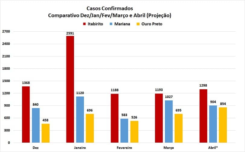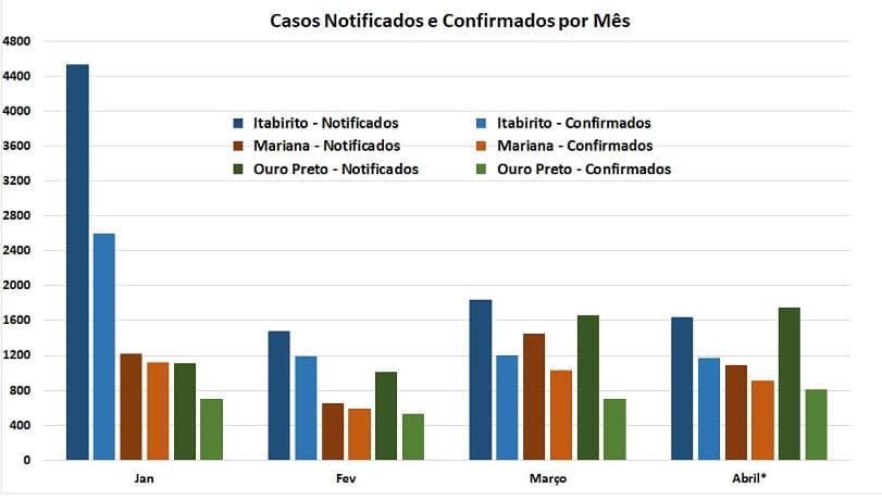 A taxa geral de contágio (relação entre positivos e notificados) na Região dos Inconfidentes sofreu pequena elevação em relação à verificada ao longo de março, passando de 55,5 para 56%. Considerando que os números da pandemia têm sido maiores este ano, no gráfico abaixo, são apresentados os números de casos notificados e confirmados em Itabirito, Mariana e Ouro Preto, de janeiro a abril, nesse caso referente à projeção dos casos a partir da média diária da primeira quinzena.