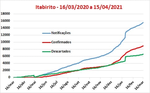 Nos gráficos abaixo são apresentadas as curvas de variação dos casos notificados, confirmados e descartados, individualmente para Mariana, Itabirito e Ouro Preto, nos meses de março/2020 a março deste ano e nos primeiros 15 dias de abril.