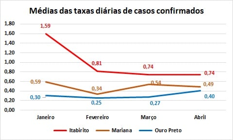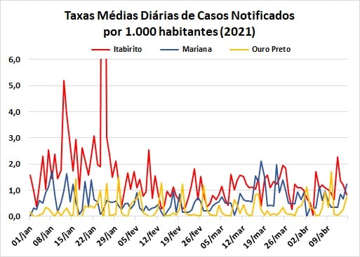 No caso das taxas médias diárias de casos notificados, Ouro Preto chegou a atingir 1,7 no dia 10/04; Itabirito atingiu o pico de 2,27 dois dias depois, enquanto Mariana teve, na quinta-feira (15) a máxima de 1,24.