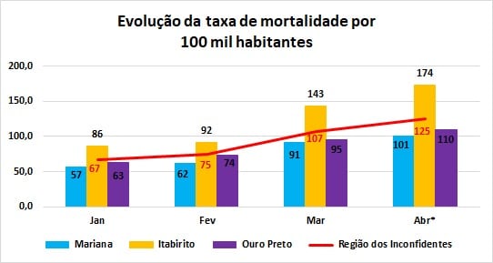 Com esses números, continua a crescente da taxa global de mortalidade na Região dos Inconfidentes, que chega a 125 por grupo de 100 mil habitantes. A taxa de letalidade (relação de óbitos em relação ao número de casos confirmados) atingiu 1,14% na 1ª quinzena de abril.