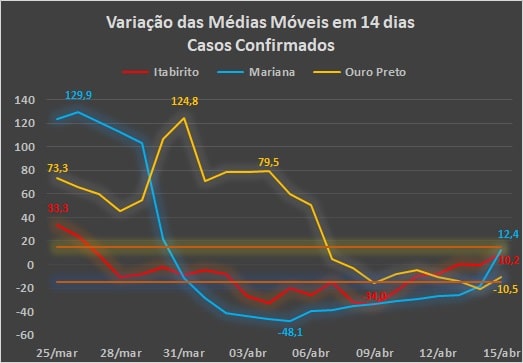 Mariana teve o pico de 129,9% em 26 de março, iniciando uma queda bastante acentuada até atingir -48,1% no dia 5 de abril, passando à tendência de piora desse indicador e atingindo 12,4% no dia 15, já próximo do limite da zona de agravamento do quadro.