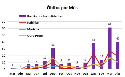 Na edição 37 do Informativo Covid-19, publicada no dia 30 de março e referente ao período de 15 a 28/03, a Agência Primaz já havia antecipado que, mesmo faltando três dias para o término do mês, março já havia se tornado o pior da pandemia, em termos de mortes associadas à Covid-19 na Região dos Inconfidentes. Na ocasião já haviam sido registrados 47 óbitos, número que subiu para 61 no dia 31/03, totalizando 202 no cômputo geral da Região dos Inconfidentes, com acréscimo de 43,3% em relação ao último dia de fevereiro.