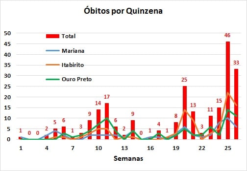 Essa comparação demonstra que a situação de óbitos não chegou a ser fortemente afetada pelas medidas tomadas na segunda quinzena de março, mantendo a situação em regime de preocupação com eventuais medidas de abrandamento das restrições nos municípios, com o registro superior às 25 mortes ocorridas na primeira quinzena de janeiro.