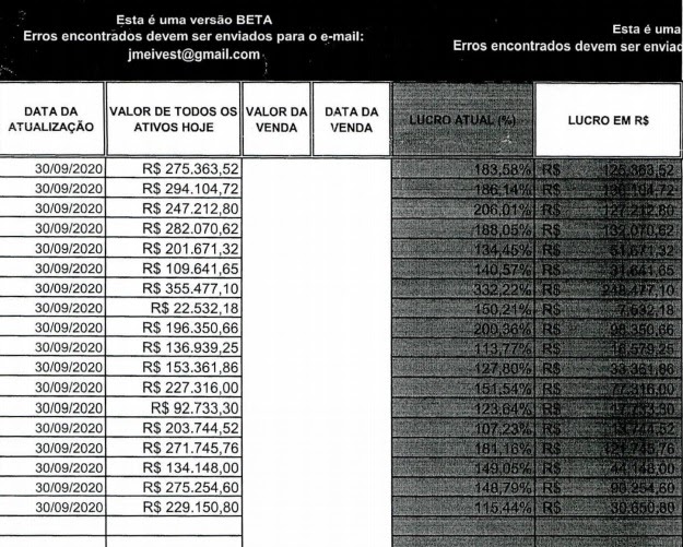 Anexada ao inquérito, encontra-se uma planilha que, supostamente, era utilizada por Jorge para demonstrar os lucros obtidos e, com isso, convencer as pessoas a manterem o investimento inicial e, até mesmo, disponibilizarem mais recursos. Nessa planilha, supostamente referente ao mês de julho de 2020, o valor acumulado é informado como um total de R$ 2.394.000,00, mas também com a indicação de R$ 2.494.000,00 (grafados como R$ 2.394.000.000,00 e 2.494.000.000,00), acompanhado de informações sobre lotes de ações adquiridos em 30/09/2019, com seus valores de compra e cotação “de hoje” (sem indicação de data). Os lucros indicados variavam de 7,23% a 232,23% em, presumivelmente, apenas 10 meses. Embora os valores dos lucros também estejam indicados em reais, a coluna relativa ao lucro no período sempre engloba o capital investido. Em outras palavras, se uma ação tivesse subido 83,59%, a indicação era de 183,59%. como pode ser visto na reprodução de parte da planilha anexada ao inquérito. Nessa planilha também é informado que trata-se de uma versão beta (de testes), recomendando o encaminhamento de erros encontrados para um endereço de e-mail supostamente de Jorge Egito.