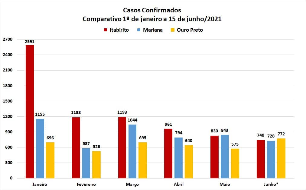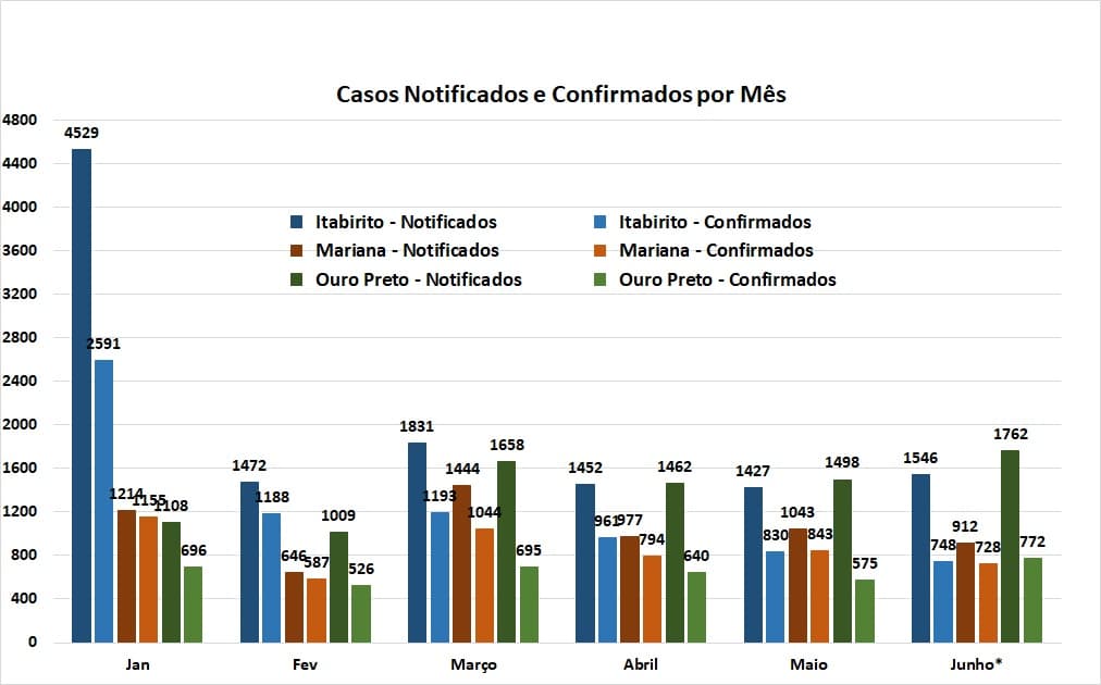 Em números absolutos, os totais de casos positivos registrados em Itabirito, Mariana e Ouro Preto, é apresentada no gráfico a seguir, para o período de janeiro a junho, considerando-se a extrapolação da média dos 15 dias para o mês inteiro.