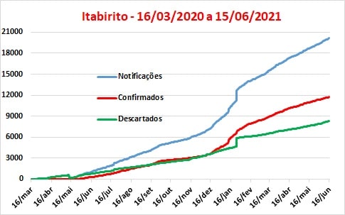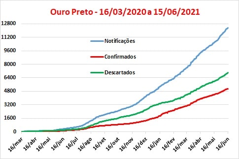 Os dados divulgados no boletim do dia 15 de junho indicavam que o município contabilizava 20.140 notificações, 11722 casos confirmados e 8.283 descartados. Em termos de casos com resultados positivos foram 374, 10 a mais que o número verificado em Mariana. As relações descartados/positivos e de descartados/notificados subiram para 70,7% e 41,1%, respectivamente.
