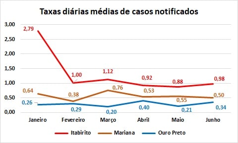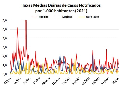 O período de 15 dias mostrou, nas três cidades da Região dos Inconfidentes, média diária de casos notificados e confirmados inferior à unidade, mas Itabirito foi o único município a apresentar números superiores a um, registrando o pico de 1,93 por mil habitantes no dia 07 de junho, porém ainda inferior ao pico de 2,65 obtido em 07 de maio.