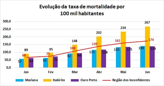 A evolução da taxa de mortalidade por 100 mil habitantes, desde 1º de janeiro, pode ser observada no gráfico a seguir, com indicação por cidade e para a Região dos Inconfidentes.