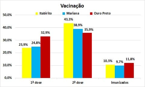 O último bloco de informações do gráfico acima mostra a porcentagem do total de habitantes de cada município da Região dos Inconfidentes que já se encontra com o ciclo completo de vacinação, estando Ouro Preto como de maior taxa de cobertura integral de sua população (11,8%).