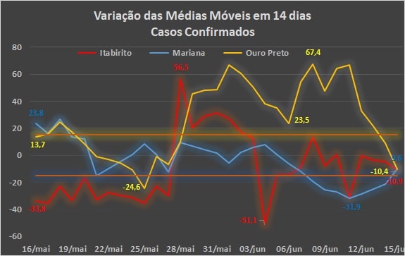 A análise da comparação de cada média móvel com a observada 14 dias antes (gráfico abaixo) para os casos confirmados, mostra que a s três cidades fecham a 1ª quinzena na zona de estabilidade, mas com comportamentos distintos desde o início de junho. Enquanto Mariana e Itabirito chegaram a frequentar a zona de reversão do quadro pandêmico, para depois sofrerem ligeiras pioras do quadro, Ouro Preto apresentou sensíveis oscilações dentro da zona de agravamento, chegando a uma variação de +67,4% no dia 8 de junho, na comparação com 14 dias antes, mas voltando a apresentar índices favoráveis a partir do dia 12.
