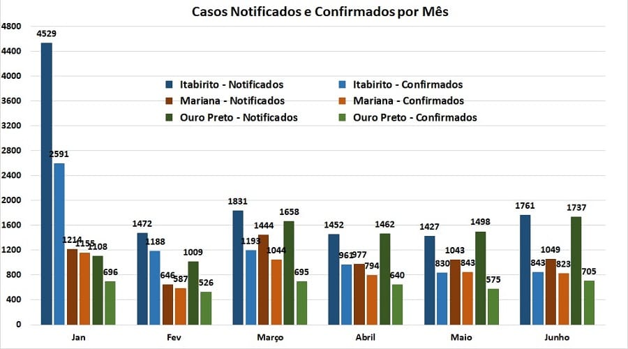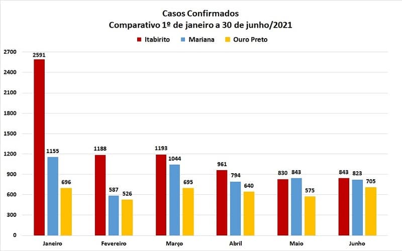 Em números absolutos, os totais de casos positivos registrados em Itabirito, Mariana e Ouro Preto, é apresentada no gráfico a seguir, para o período de janeiro a junho. A taxa geral de contágio (relação entre positivos e notificados) na Região dos Inconfidentes, que vinha em constante crescimento desde novembro, recuou de 56,3 para 55,9%.