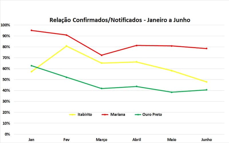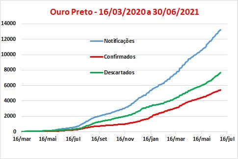 A relação casos descartados/casos confirmados, em Ouro Preto, continua em crescimento, atingindo 140,8% em 30 de junho, o mesmo ocorrendo (de 56,4 para 57,8%) com a relação descartados/notificados que sempre se manteve a maior na Região dos Inconfidentes. No final de junho as notificações chegaram a 12.249, confirmando a tendência verificada no final da 1ª quinzena do mês, de superar o número registrado em Mariana –, com 5.437 confirmados e 7.657 descartados. Esses totais ocorreram mesmo com o menor número de casos confirmados (717) mas com o maior de notificações (1.782) em Ouro Preto, durante o mês de junho.