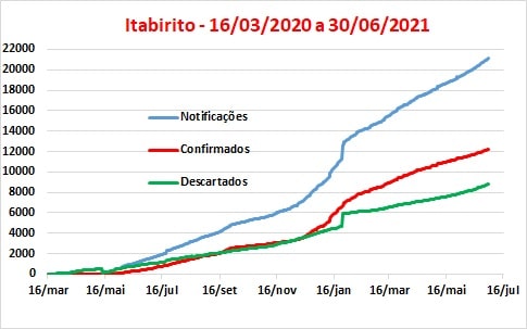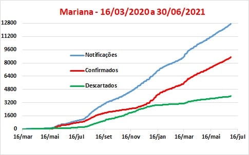 Os dados divulgados no boletim do dia 30 de junho indicavam que o município contabilizava 21.128 notificações, 12.191 casos confirmados e 8.797 descartados. Em termos de casos com resultados positivos foram 843, 20 a mais que o número verificado em Mariana, e o maior da região. As relações descartados/positivos e de descartados/notificados subiram para 72,2% e 41,6%, respectivamente.