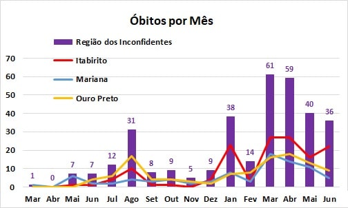 Em queda desde abril, em junho foram registrados 36 óbitos na Região dos Inconfidentes, número somente maior do que o de fevereiro, em 2021. Itabirito continua com a maior porcentagem de mortes (41,5%), seguida por Ouro Preto (32,9%) e Mariana (25,5%), de acordo com os dados relativos ao último dia de junho.