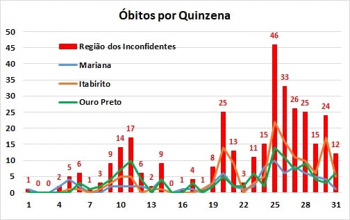 No fechamento da 2ª quinzena de junho foi mantida a tendência, estabelecida desde abril, de maior número de vítimas nos primeiros quinze dias do mês, desta vez com redução de 50%, a maior verificada no período. A taxa global de mortalidade por 100 mil habitantes, na Região dos Inconfidentes, continua em alta, porém com tendência de menor variação desde abril, reduzindo a relação em 29,2% (abril) e 15,3% (maio), na comparação com os respectivos meses anteriores. Já a taxa global de letalidade (relação de óbitos em relação ao número de casos confirmados), continua aumentando desde fevereiro (0,86%), chegando a 1,28% em 30 de junho, mas mostrando um pequeno recuo em relação ao valor apurado no final da 1ª quinzena.