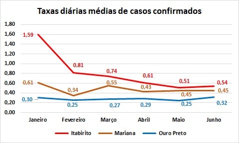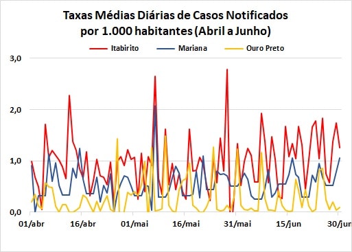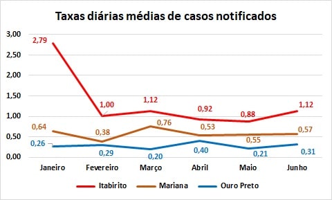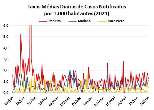 Ouro Preto e Mariana apresentaram médias diárias de casos notificados e confirmados (por mil habitantes) inferior à unidade. Em Ouro Preto essas médias alcançaram, respectivamente, 0,31 e 0,32, enquanto em Mariana chegaram a 0,57 e 0,45. Em Itabirito, a média diária de casos notificados atingiu 1,12, ficando em 0,54 a de casos confirmados, com picos de, respectivamente, 1,93 e 1,3.