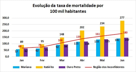 A evolução da taxa de mortalidade por 100 mil habitantes, desde 1º de janeiro, pode ser observada no gráfico a seguir, com indicação por cidade e para a Região dos Inconfidentes.