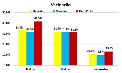 A divulgação dos números relacionados à vacinação nos municípios da Região dos Inconfidentes continua não sendo feita de forma regular. Em junho, os dados mais recentes disponíveis, são dos dias 24 (Mariana), 26 (Ouro Preto) e 30 (Itabirito). Com essas informações, no gráfico abaixo são apresentadas as porcentagens de cobertura da 1ª dose, em relação às populações consideradas pela SES-MG para os três municípios. Os números indicados como 2ª dose referem-se à porcentagem das pessoas com imunização completa, em relação às que haviam recebido a 1ª dose. Em outras palavras, em Ouro Preto, pouco mais de 41,5% da população havia recebido a 1ª dose, das quais 31,3% também já receberam a 2ª, observando-se que, mesmo com a liderança da dose inicial, o município tem o pior resultado relativo, em termos de imunização total, embora com valor muito próximo dos demais municípios.