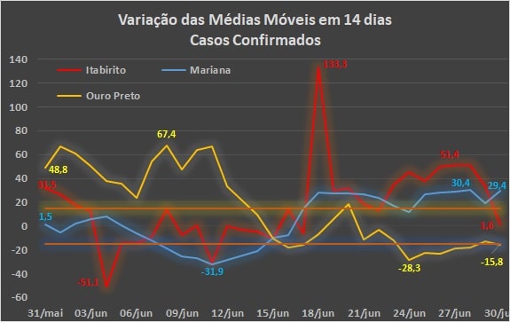A análise da comparação de cada média móvel com a observada 14 dias antes (gráfico abaixo) para os casos confirmados, mostra que apenas Mariana fechou o mês de junho na zona de agravamento do quadro pandêmico, com aumento de 29,4%, enquanto Itabirito, depois de um pico absurdo de 133,3% de aumento, verificado no dia 18 de junho, reverteu o quadro, chegando à zona de estabilidade, no dia 30 de junho, com aumento de apenas 1,6%. Por sua vez, Ouro Preto frequentou a zona de estabilidade entre os dias 14 e 23, permanecendo na região de reversão a partir do dia 24 e chegando ao recuo de 15,8% no último dia do mês.
