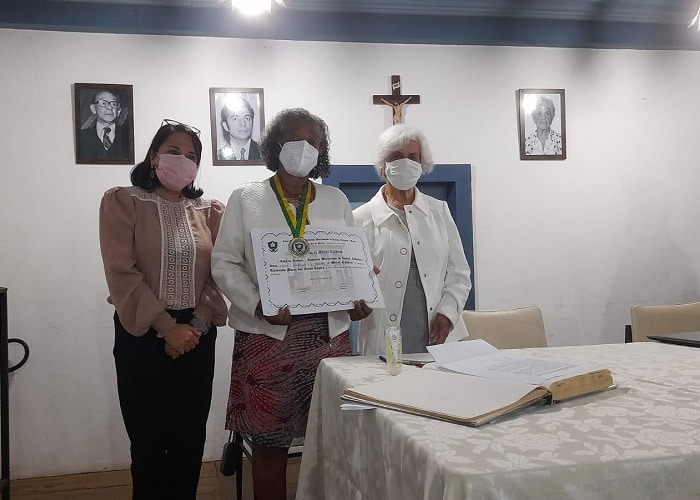 Na parte final da cerimônia, a Presidente da Academia Marianense, Hebe Rôla, fez a entrega de medalha e diploma de honra ao mérito a Raimunda Maria dos Anjos Castro, presidente do Movimento Renovador de Mariana, ressaltando sua atuação como educadora e batalhadora pelas causas em prol da cidade.