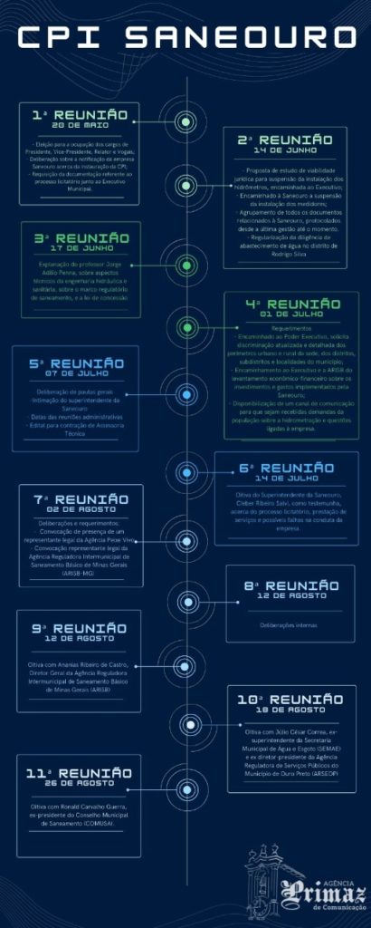 No dia 12, a 9ª sessão da CPI colheu depoimentos do senhor Ananias Ribeiro de Castro, Diretor Geral da Agência Reguladora Intermunicipal de Saneamento Básico de Minas Gerais (ARISB). Dentre as atribuições, a Agência é responsável pela regulação do serviço de água e esgoto em Ouro Preto, tendo ligação direta com a Saneouro. Segundo Ananias, o modo de atuação da ARISB baseia-se fundamentalmente na Lei Nº 11.445, de 2007, que dita as diretrizes nacionais para o saneamento básico. Quando indagado pelo vereador Renato Zoroastro sobre a lesividade do contrato perante o município, Ananias diz que “quando se fala em lesividade, quem está lesando, é uma questão que deve ser verificada na origem. Quem é que faz o contrato, é um prestador de serviço? Não. O prestador de serviço, uma concessionária, quando ela assina um contrato ela assina um contrato que foi elaborado pelo município. Edital de convocação para concessão é uma atribuição do município. A lei 11445 diz que cabe ao titular definir de serviço definir quem será o prestador de serviço, definir, dentre outras coisas, quem fará a regulação desse serviço, portanto são prerrogativas, indelegáveis.”