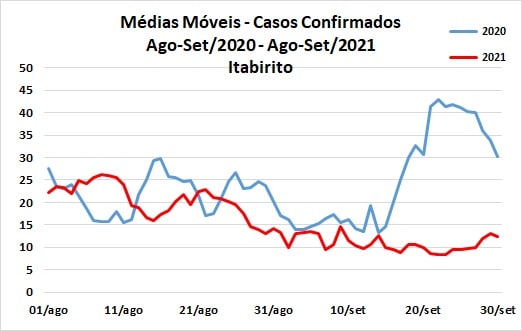 Nota-se, em Itabirito, diferenças na comparação entre os dois períodos, desde 25 de agosto, com notável diminuição das médias móveis a partir de 14 de setembro.