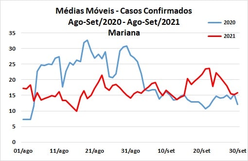 Já em Mariana, a situação da comparação foi invertida. De 04 de agosto a 04 de setembro, as médias móveis verificadas em 2021 foram menores que as de 2020, com crescimento este ano, a partir daí, mas com tendência de queda depois de atingido o pico em 22 de setembro.