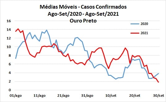 Em Ouro Preto, depois de oscilações e inversões de posições, até 18 de setembro, as médias móveis ficaram em 2021 ficaram ligeiramente maiores, acompanhando a mesma queda verificada em 2020, passando a valores inferiores nos últimos dias do mês de setembro.