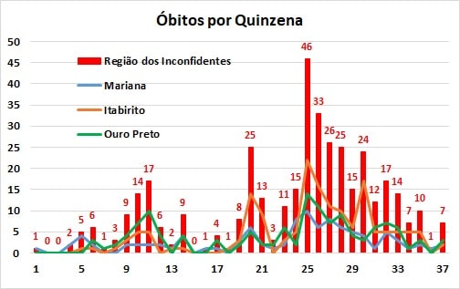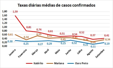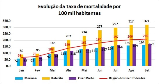 A taxa global de mortalidade por 100 mil habitantes, na Região dos Inconfidentes, que estava em 196,6 no final de julho, passou para 205,6 em agosto e para 209,9 em setembro, mantendo o crescimento, mas com menores taxas de aumento (4,6% de julho para agosto e 2,1% de agosto para setembro). Já a taxa global de letalidade (relação de óbitos em relação ao número de casos confirmados), sofreu pequenos recuos no período, em Mariana e Ouro Preto, subindo ligeiramente (de 1,15 para 1,7%) em agosto, mas apresentado um também pequeno decréscimo em setembro, quando resultou em 1,16%.