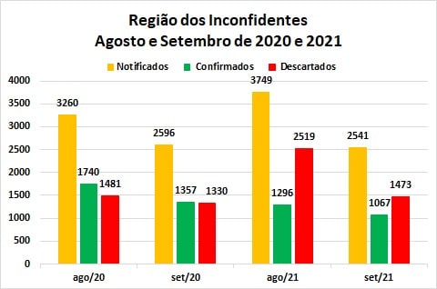 Como já destacado, apenas dois índices apresentaram crescimento na comparação dos bimestres agosto/setembro de 2021, em relação a 2020. Um deles, expressivo, foi o aumento de 42% no número de casos descartados, que pode significar uma menor taxa de transmissão do novo coronavírus na Região dos Inconfidentes. O outro, embora significativamente menor (7,4%), refere-se ao número de casos confirmados.