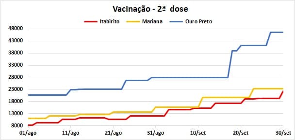 Passados 12 meses, agosto e setembro representam a 5ª e a 6ª quedas consecutivas do número de óbitos, respectivamente 17 e 8, desde o recorde (61) registrado em março, sendo que ocorreram 31 óbitos na Região dos Inconfidentes no mês de julho, igualando o número de julho de 2020.