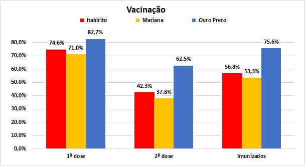 Os dados mais recentes disponíveis, dentro do período deste Informativo Covid-19, são dos dias 23 (Mariana), 27 (Ouro Preto) e 30 (Itabirito). Com essas informações, no gráfico abaixo são apresentadas as porcentagens de cobertura da 1ª dose, em relação às populações totais consideradas pela SES-MG para os três municípios. Os números indicados como 2ª dose referem-se à porcentagem das pessoas com imunização completa, em relação às que haviam recebido a 1ª dose. Em outras palavras, em Ouro Preto, dos 82,7% que receberam a 1ª dose até o dia 27 de setembro, 75,6% também já haviam também recebido a 2ª ou tinham sido imunizados com a dose única da Janssen.