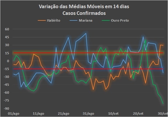 A análise da comparação de cada média móvel com a observada 14 dias antes (gráfico abaixo) para os casos confirmados, mostra que as três cidades apresentaram um comportamento com grandes oscilações do indicador, até o dia 23 de setembro, com destaque para Itabirito, cujas médias variaram entre as zonas de estabilidade e de recuperação do quadro pandêmico. A partir daí tanto Ouro Preto quanto Mariana passaram a registrar valores decrescentes, enquanto Itabirito experimentou um alta, finalizando o período com variação positiva de 29,9%, com -22,4% para Mariana e -80,9% em Ouro Preto.