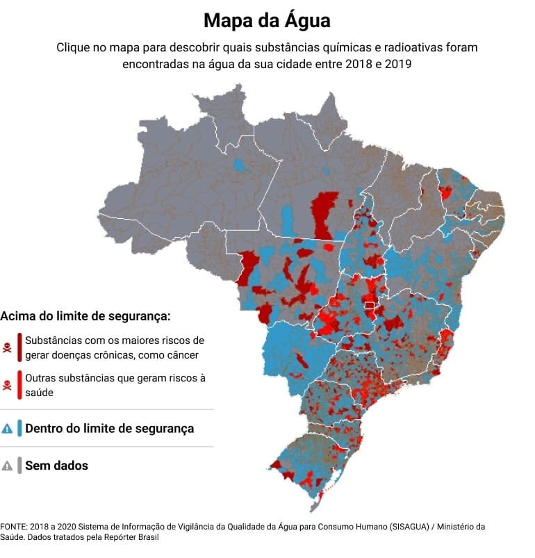 As informações podem ser consultadas por cidade no Mapa da Água, que destaca quais substâncias extrapolaram o limite e explica seus riscos. Os dados são resultados de testes feitos por empresas ou órgãos de abastecimento e enviados ao Sisagua (Sistema de Informação de Vigilância da Qualidade da Água para Consumo Humano), do Ministério da Saúde. Os testes são feitos após o tratamento e a maioria dessas substâncias não pode ser removida por filtros ou fervendo a água.