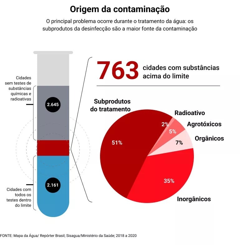 As substâncias radioativas aparecem acima do limite em 22 municípios brasileiros, a maioria em Minas Gerais. Elas podem estar na água devido a resíduos da indústria, mas também de forma natural, devido à presença do urânio e outros minérios. Deveria haver uma preocupação dobrada nesses casos, pois elas intoxicam por ingestão e inalação, afirma Viviane Amaral, pesquisadora da Universidade Federal do Rio Grande do Norte. No entanto, elas são as menos testadas, apenas 2% do total de testes feitos entre 2018 e 2020.