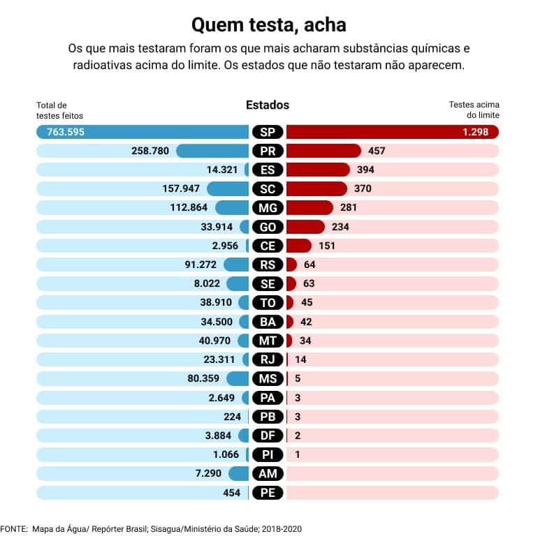Quase todos os estados que testaram a água acharam problemas. São Paulo foi o que mais encontrou, com 1.298 resultados acima do limite, mas também foi o que mais testou. Foram 831 mil testes, 45% de todos os realizados no país.