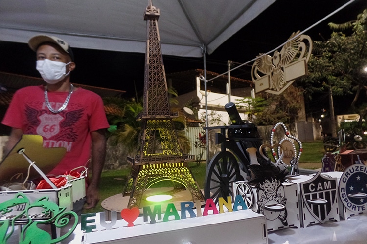 Por fim, Erika Curtiss e Banda trouxeram o melhor do samba aquecendo a Praça dos Ferroviárias. O espaço passou por recente revitalização com nova iluminação e reforma do palco principal, deixando tudo mais aconchegante. Aliás, a Feira Noturna é sobre acolhimento e incentivo. Anderson Mateus, carioca recém-chegado a Mariana, teve a oportunidade de expor seus trabalhos na feira. O artesão deixou claro sua paixão pelo município, que já visitou outras vezes, contudo agora é oficialmente morador. “Na verdade, eu não trabalhava com essa parte do artesanato, eu sou do Rio, fazia por hobby. Veio a pandemia e a gente precisou se reinventar, se modificar. Peguei uma paixão muito grande tanto por artesanato quanto pela cidade de Mariana. Visitei a primeira vez faz 5 anos, a primeira vez que estive aqui já foi amor à primeira vista. Todos os anos eu vinha ‘pra’ cá, menos 2020, mas em agosto de 2021 eu decidi mudar ‘pra’ cá e trabalhar com artesanato. Minhas expectativas são todas muito positivas, o local é tranquilo, muito aconchegante, acolhedor, o povo é muito acolhedor também. Minhas expectativas são 100% sucesso”, relata