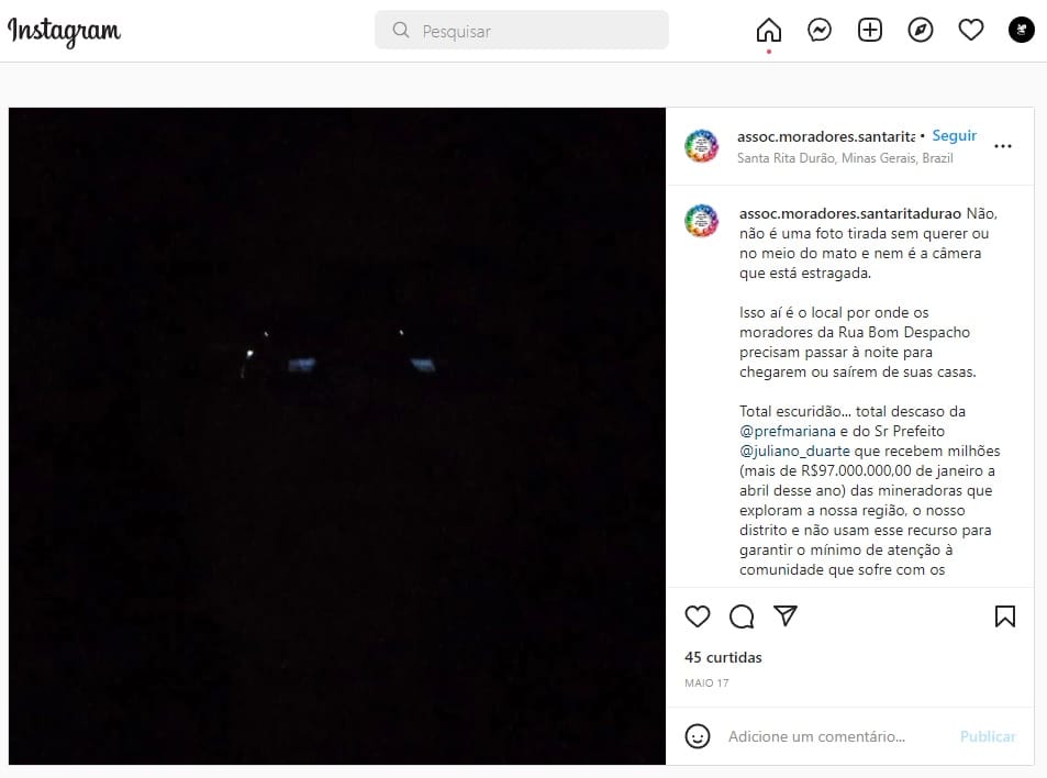Nos comentários da publicação, moradores do Bairro Santa Clara reclamam da falta de iluminação pública no local. No mês passado, a Associação de Moradores de Santa Rita Durão (AMSRD) denunciou, através do perfil no Instagram, que existem locais do distrito que estão sem luz, listando a Rua Bom Despacho, a Rua Vicente de Paula Ribeiro e a Rua D como locais em parcial ou completa escuridão.