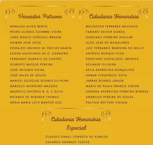 De acordo com os artigos 156 e 157 do Regimento Interno da Câmara de Mariana, a Resolução nº 08, aprovada em 30 de maio deste ano, designou 15 pessoas para receberem o título de Cidadania Honorária de Mariana, tendo como patrono os 15 vereadores que compunham a Câmara na ocasião, entre eles o vereador Gilberto “Tikim” Mateus (Cidadania), suplente de Juliano Duarte, que perdeu o posto recentemente, devido ao retorno do ex-prefeito interino. A mesma resolução incluiu Cláudio Daniel Fonseca de Almeida e Eduardo de Andrade Tostes, como homenageados com o título da Cidadãos Honorários em caráter especial.