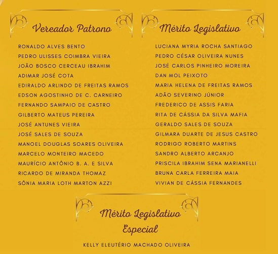 Ainda de acordo com os artigos 156 e 157 do Regimento Interno da Câmara de Mariana, a Resolução nº 07, igualmente aprovada em 30 de maio deste ano, elencou 15 personalidades marianenses como homenageadas pelo Mérito Legislativo, cada uma indicada por um dos vereadores.
